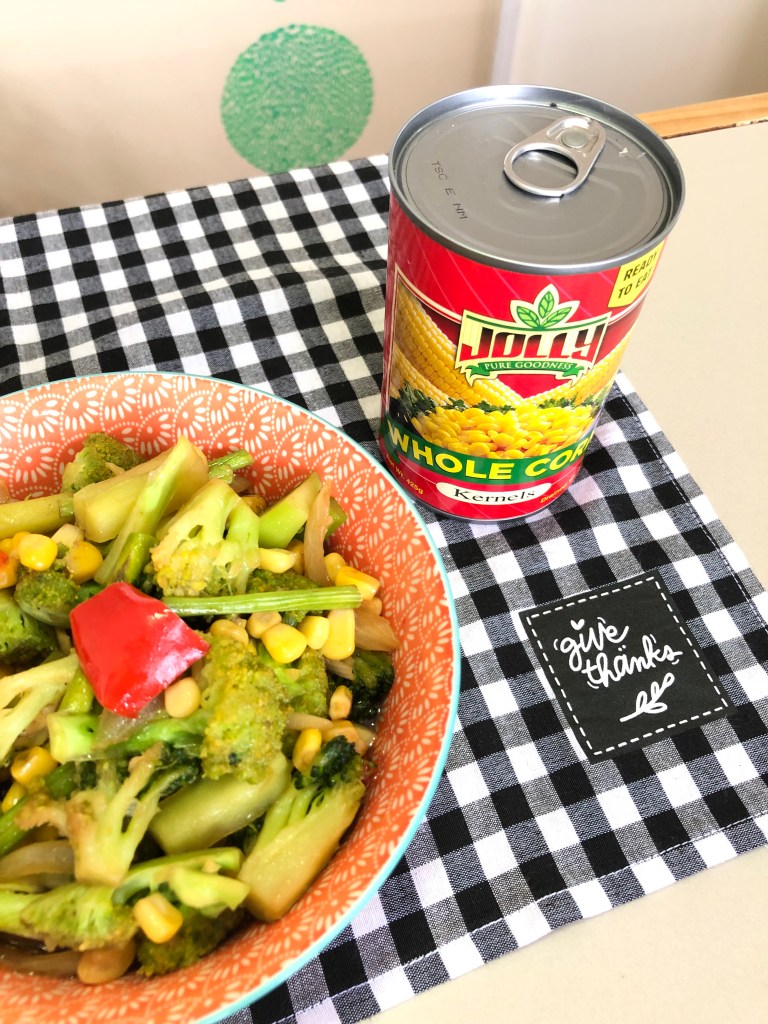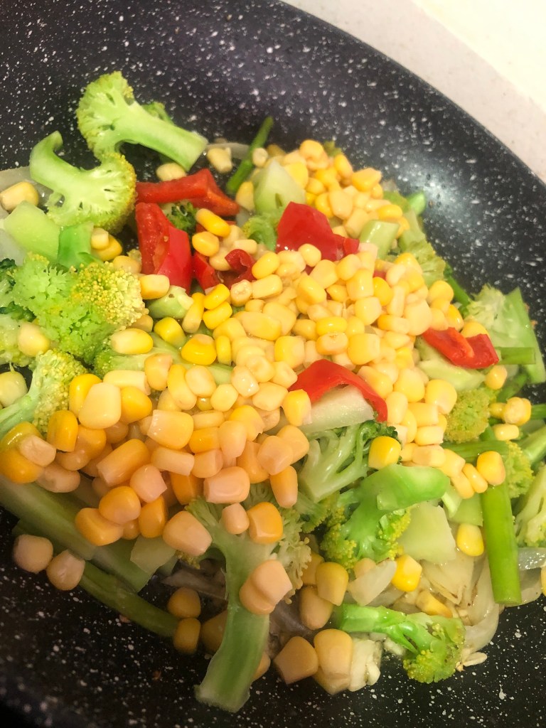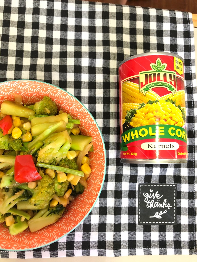 For today’s dish, I created Simple Buttered Corn and added some veggies: asparagus, broccoli, some bellpepper, and onions. Amazing!