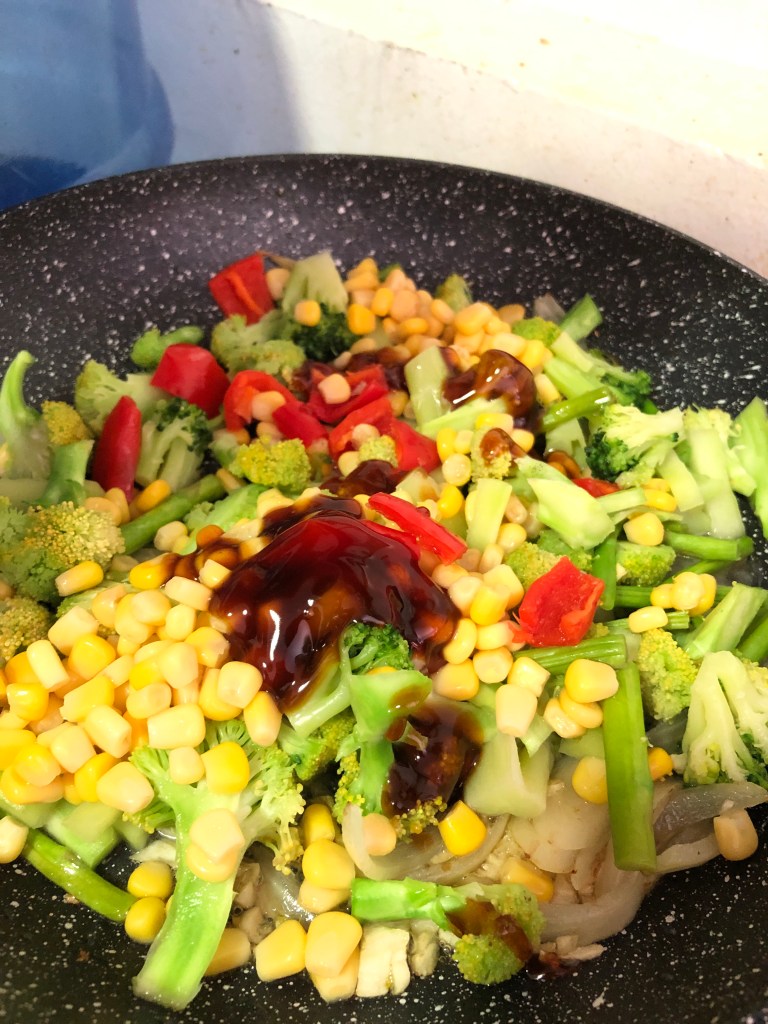 - Add in a bit of water and the oyster sauce. Cover the pan with a lid and let the veggies soften.